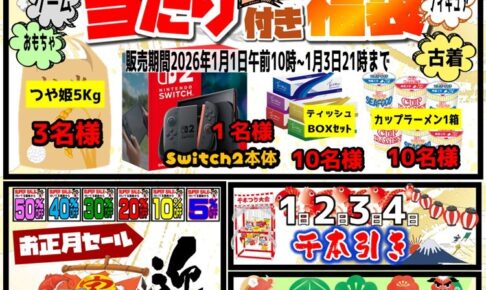 イベント情報1月1日販売【当たり付福袋】販売!! 大当たりはなんとSwitch2本体です。 お正月中はお楽しみがいっぱいです。 是非遊びに来てください。待ってるよ!!