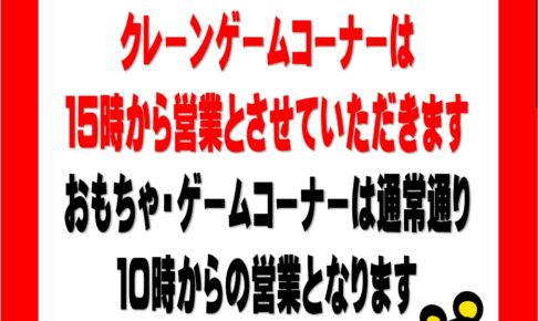 お知らせ【重要】4/8(水)の営業時間についてのお知らせです。 4/8(水)は店内改装のためクレーンゲームコーナーは15時からの営業となります。 おもちゃ・ゲームコーナーは通常通り10時からの営業となります。 お客様には大変ご迷…