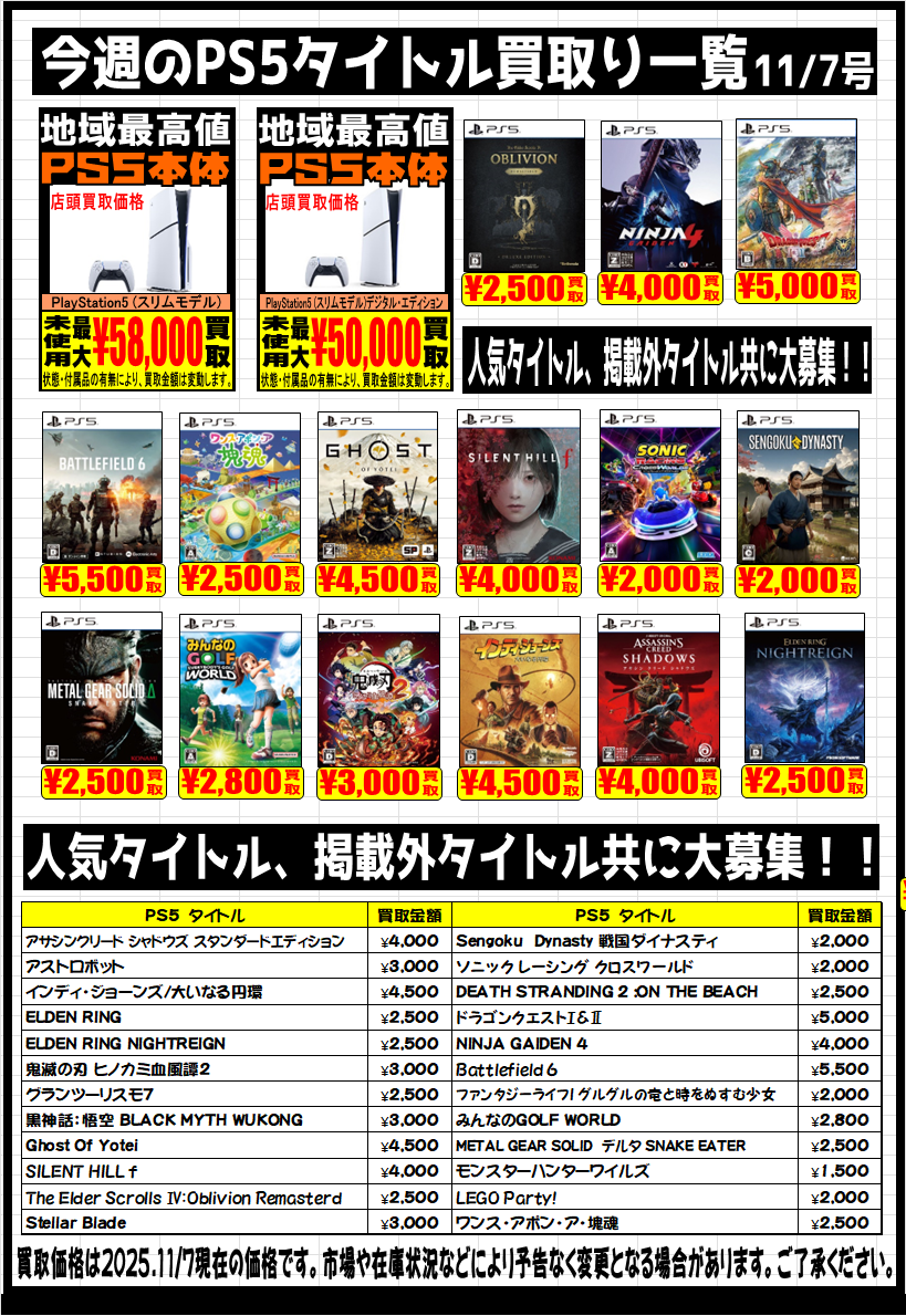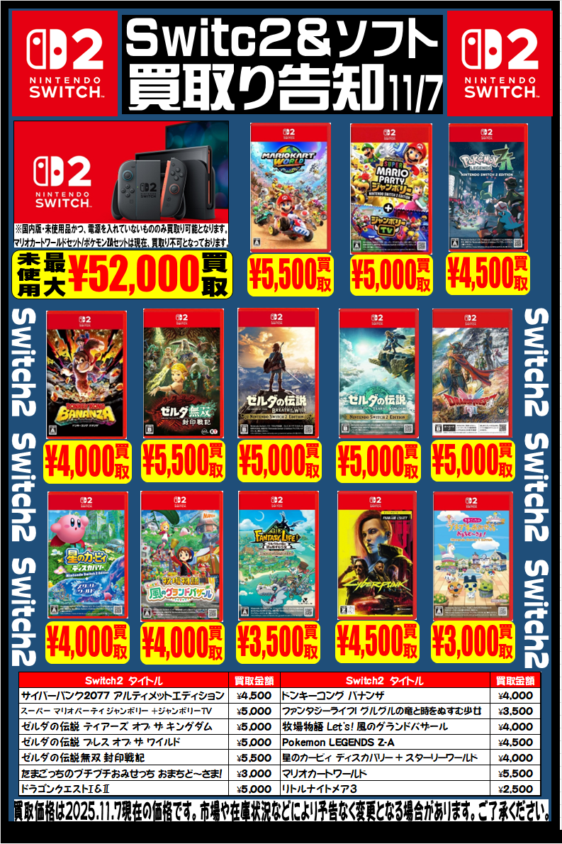 ★【Switch2】【Switch】【PS5】強化買取中です!★ 2025年11月7日 【Switch2】【Switch】【PS5】強化買取中です! 是非この機会に査定にお持ちください。ご来店お待ちしております。 ※2025/11/7現在の価格となっております。 相場、在庫状況により告知なく価格が変更となる場合がございますのでご了承ください。 その他買取情報はこちら!