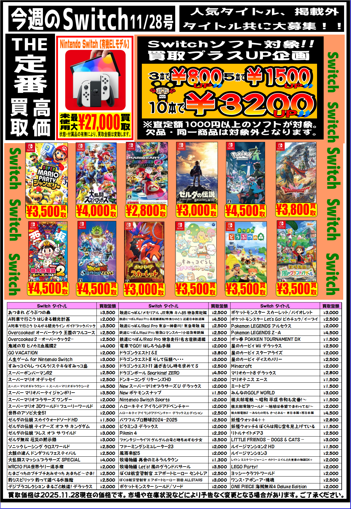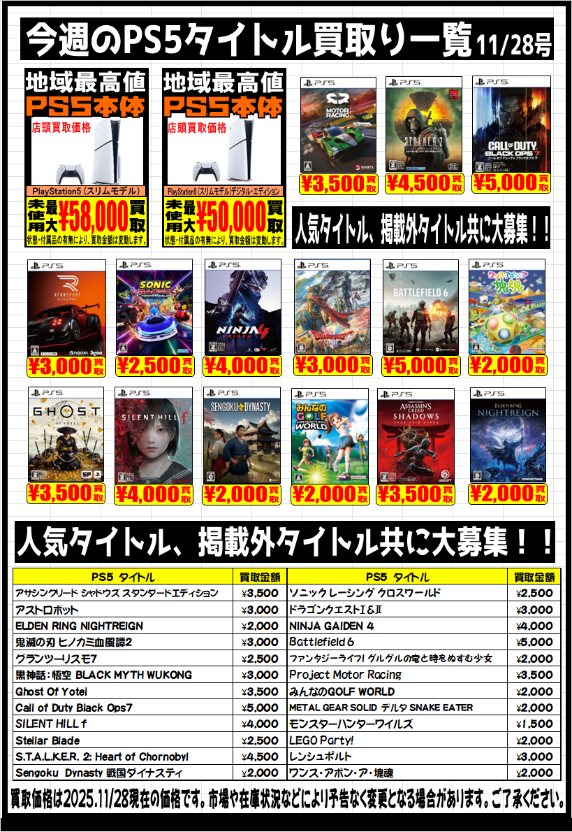 【Switch2】【Switch】【PS5】強化買取中です。 2025年11月28日 【Switch2】【Switch】【PS5】強化買取中です。 是非この機会に査定にお持ちください。ご来店お待ちしております。 ※2025/11/28現在の価格となっております。 相場、在庫状況により告知なく価格が変更となる場合がございますのでご了承ください。 その他買取情報はこちら!