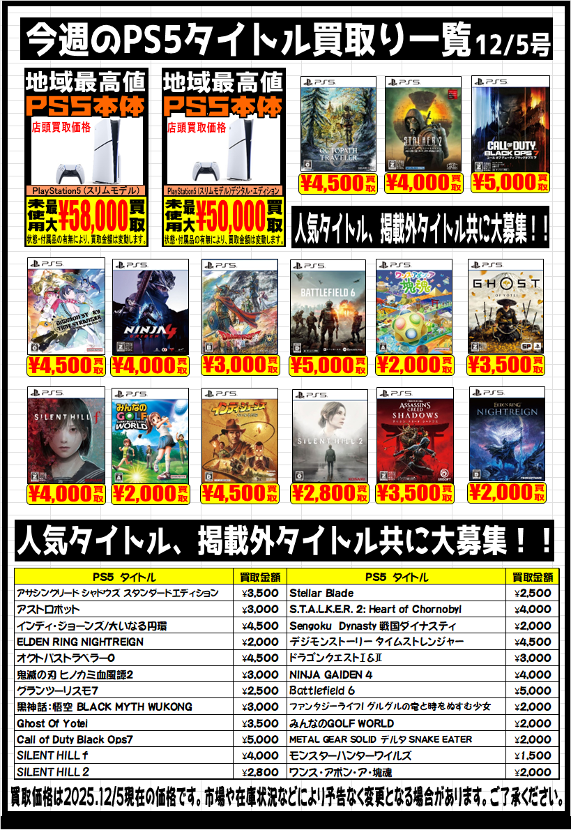 【Switch2】【Switch】【PS5】強化買取中です! 2025年12月5日 【Switch2】【Switch】【PS5】強化買取中です。 是非この機会に査定にお持ちください。ご来店お待ちしております。 ※2025/12/5現在の価格となっております。 相場、在庫状況により告知なく価格が変更となる場合がございますのでご了承ください。 その他買取情報はこちら!