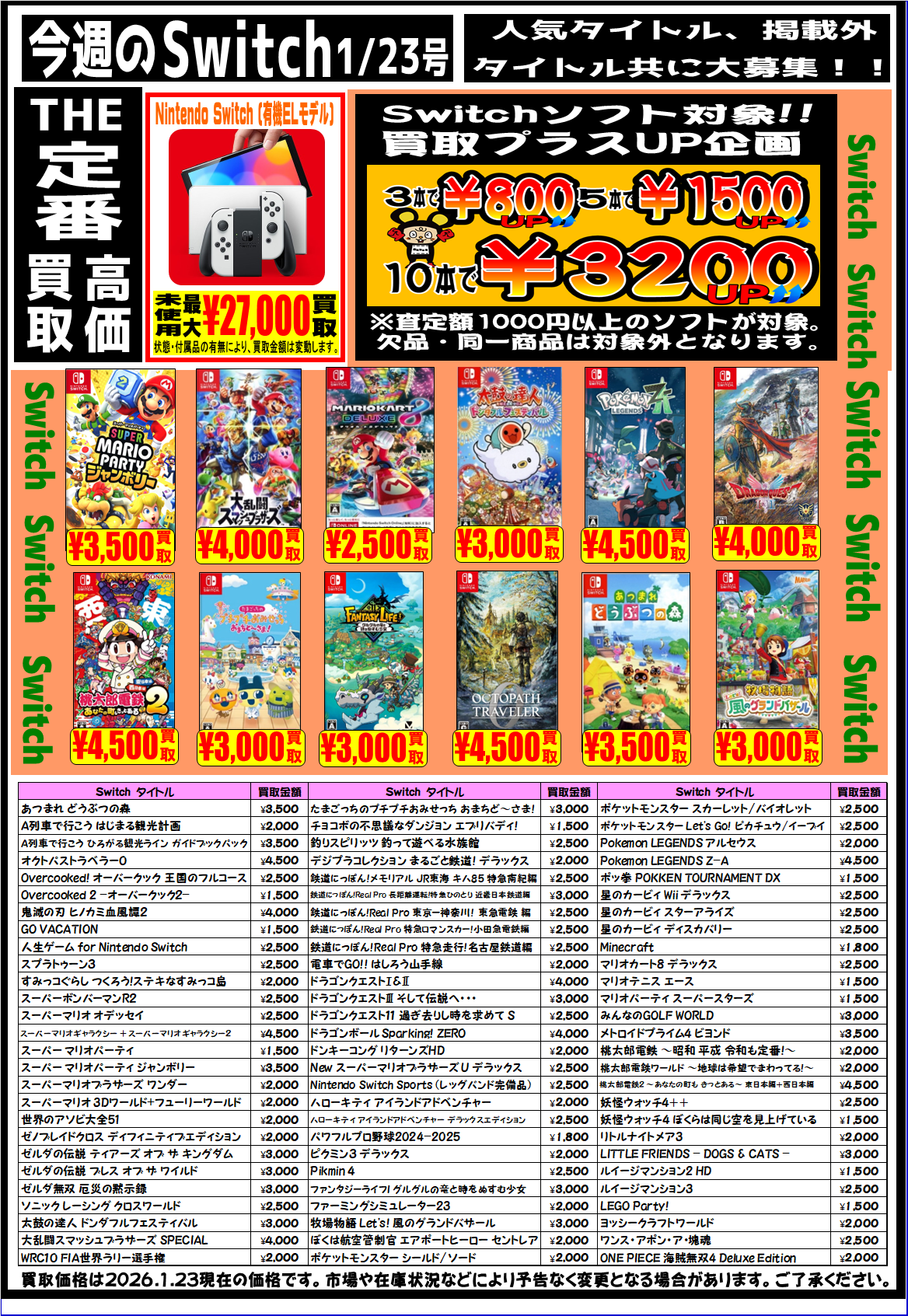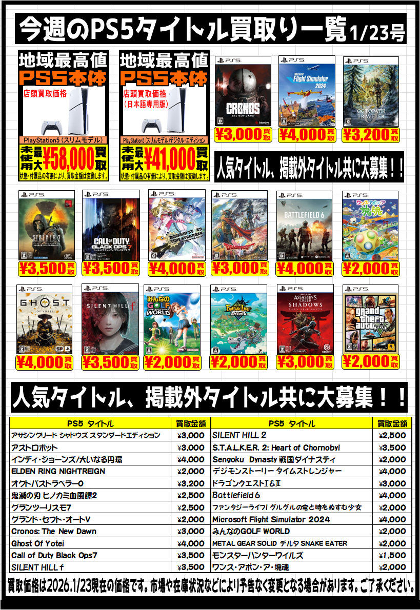 ★【Switch2】【Switch】【PS5】強化買取中です。★ 2026年1月22日 【Switch2】【Switch】【PS5】強化買取中です。 是非この機会に査定にお持ちください。 ご来店お待ちしております。 ※2026/1/22現在の価格となっております。 相場、在庫状況により告知なく価格が変更となる場合がございますのでご了承ください。 ****************************** その他買取情報はこちら!