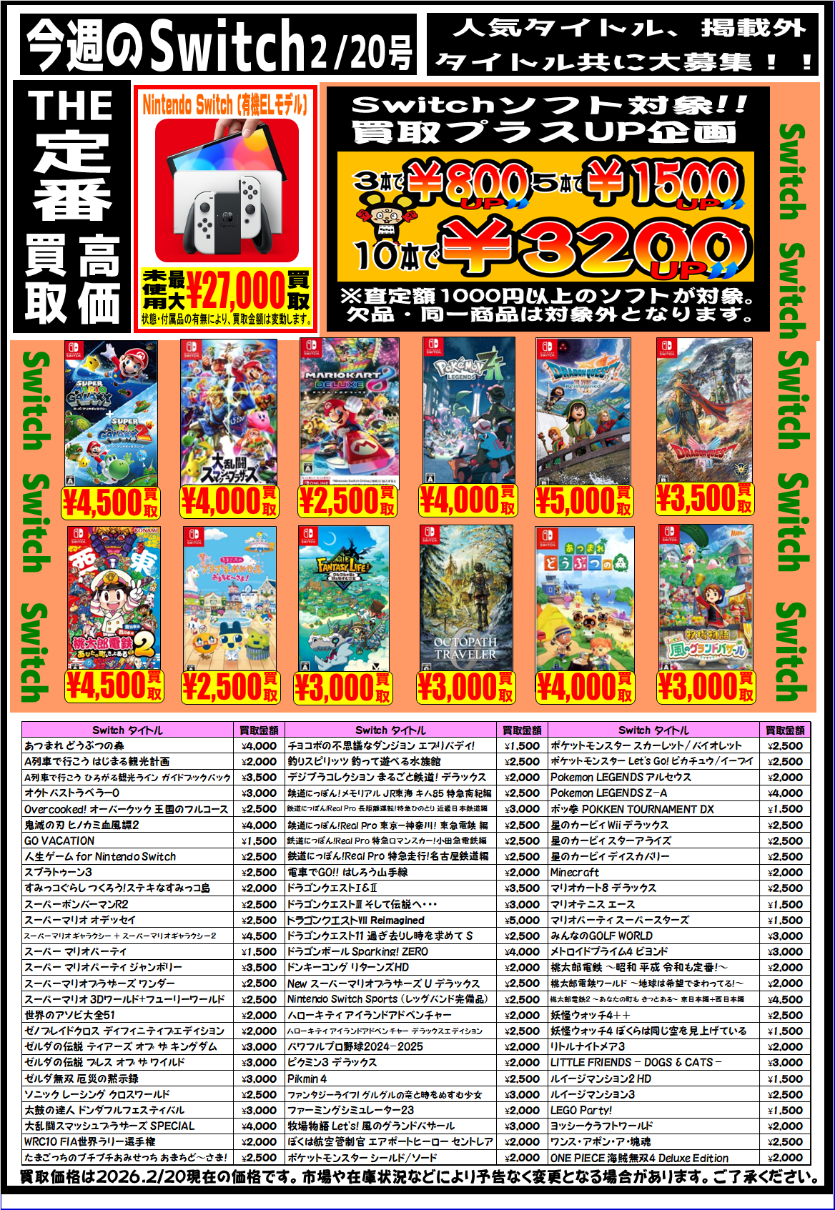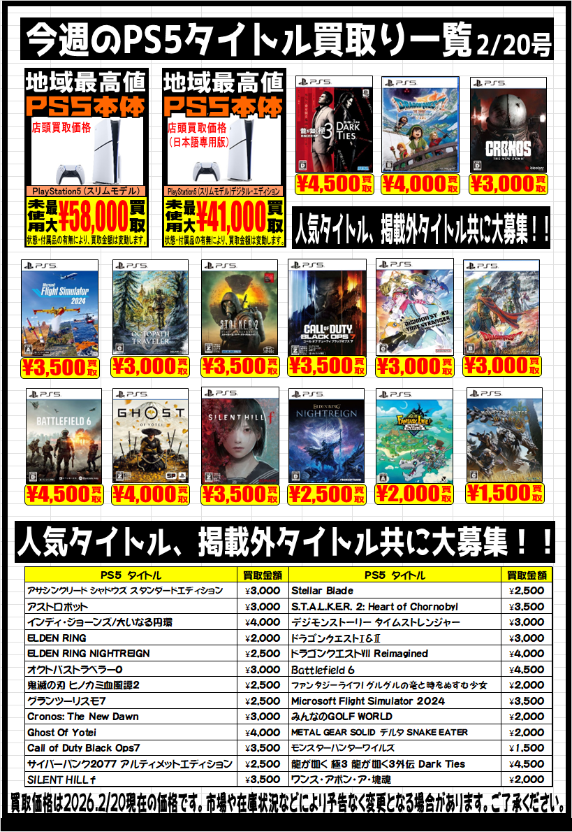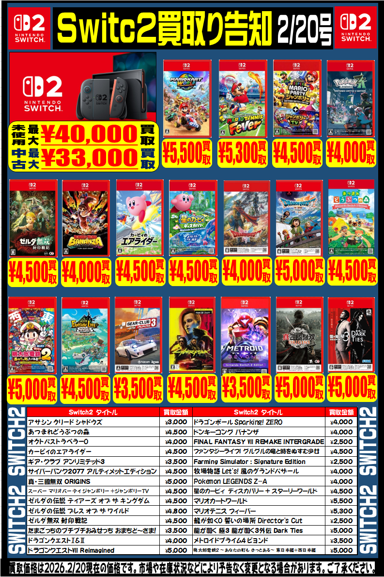 【Switch2】【Switch】【PS5】強化買取中です。 2026年2月20日 【Switch2】【Switch】【PS5】強化買取中です。 是非この機会に査定にお持ちください。ご来店お待ちしております。 ※2026/2/20現在の価格となっております。 相場、在庫状況により告知なく価格が変更となる場合がございますのでご了承ください。 ****************************** その他買取情報はこちら!