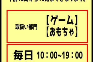 ★買取受付時間のお知らせ★ 2026年3月4日 に投稿された★買取受付時間のお知らせ★ 買取受付時間は、10時から19時までとなります。 取扱い部門は【ゲーム】【おもちゃ...