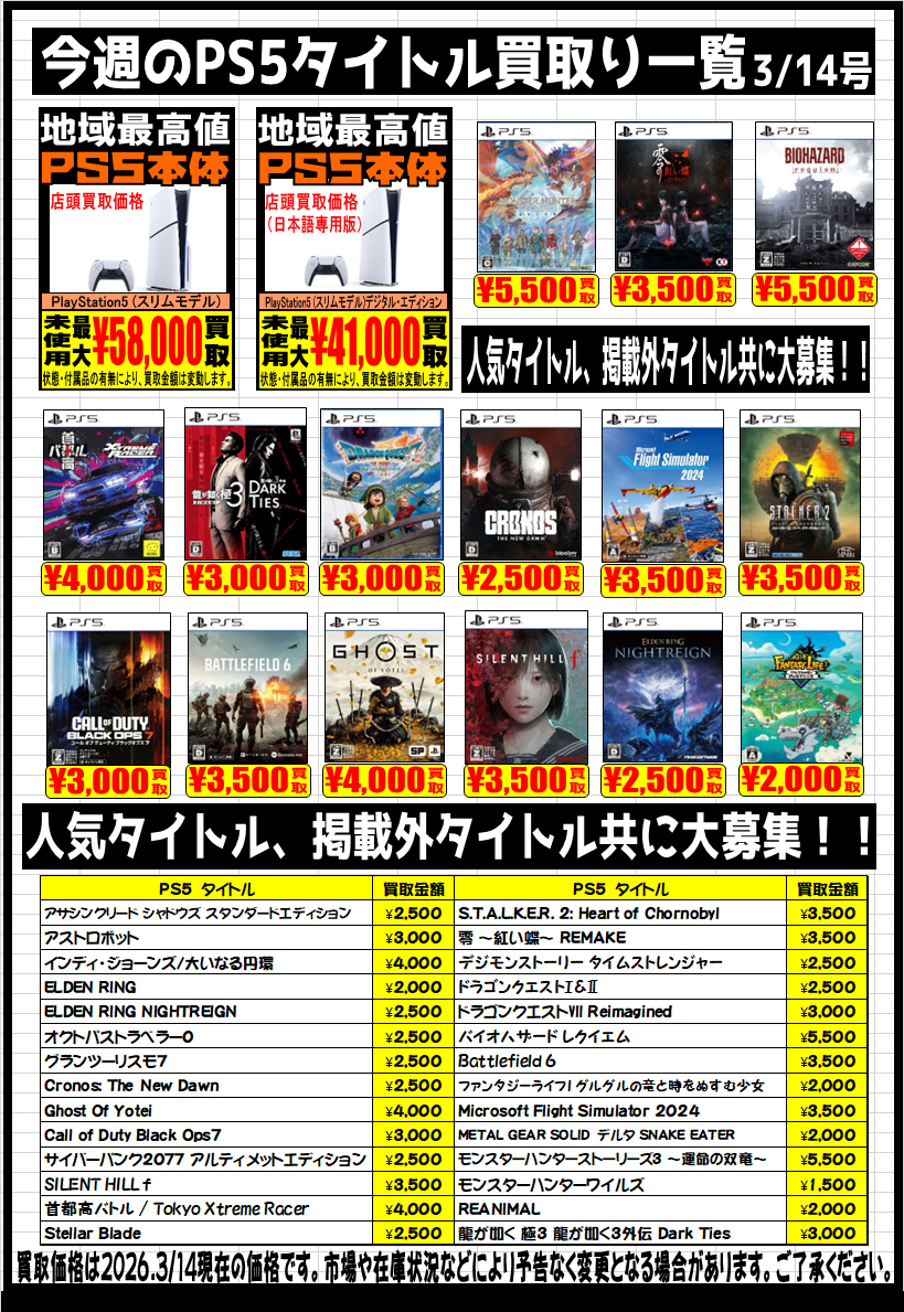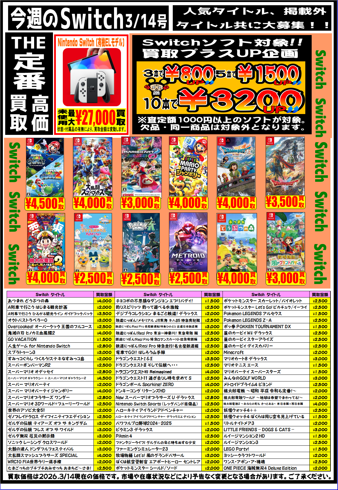 ★【Switch2】【Switch】【PS5】強化買取中です!★ 2026年3月15日 【Switch2】【Switch】【PS5】強化買取中です! 是非この機会に査定にお持ちください。ご来店お待ちしております。 ※2026/3/15現在の価格となっております。 相場、在庫状況により告知なく価格が変更となる場合がございますのでご了承ください。 ****************************** その他買取情報はこちら!