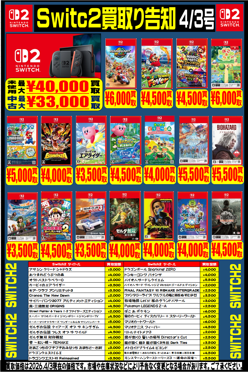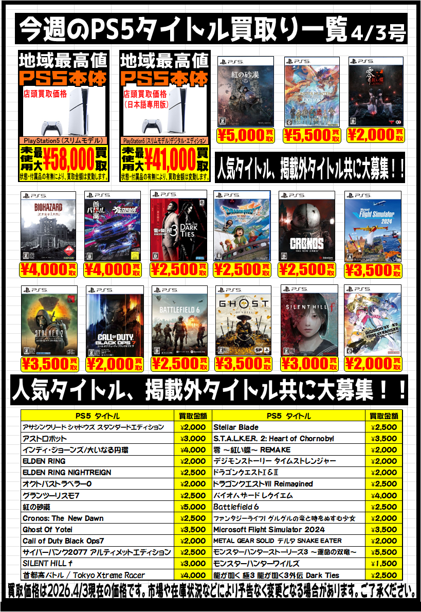 【Switch2】【Switch】【PS5】強化買取中! 2026年4月3日 【Switch2】【Switch】【PS5】強化買取中です。 是非この機会に査定にお持ちください。ご来店お待ちしております。 ※2026/4/3現在の価格となっております。 相場、在庫状況により告知なく価格が変更となる場合がございますのでご了承ください。 ****************************** その他買取情報はこちら!