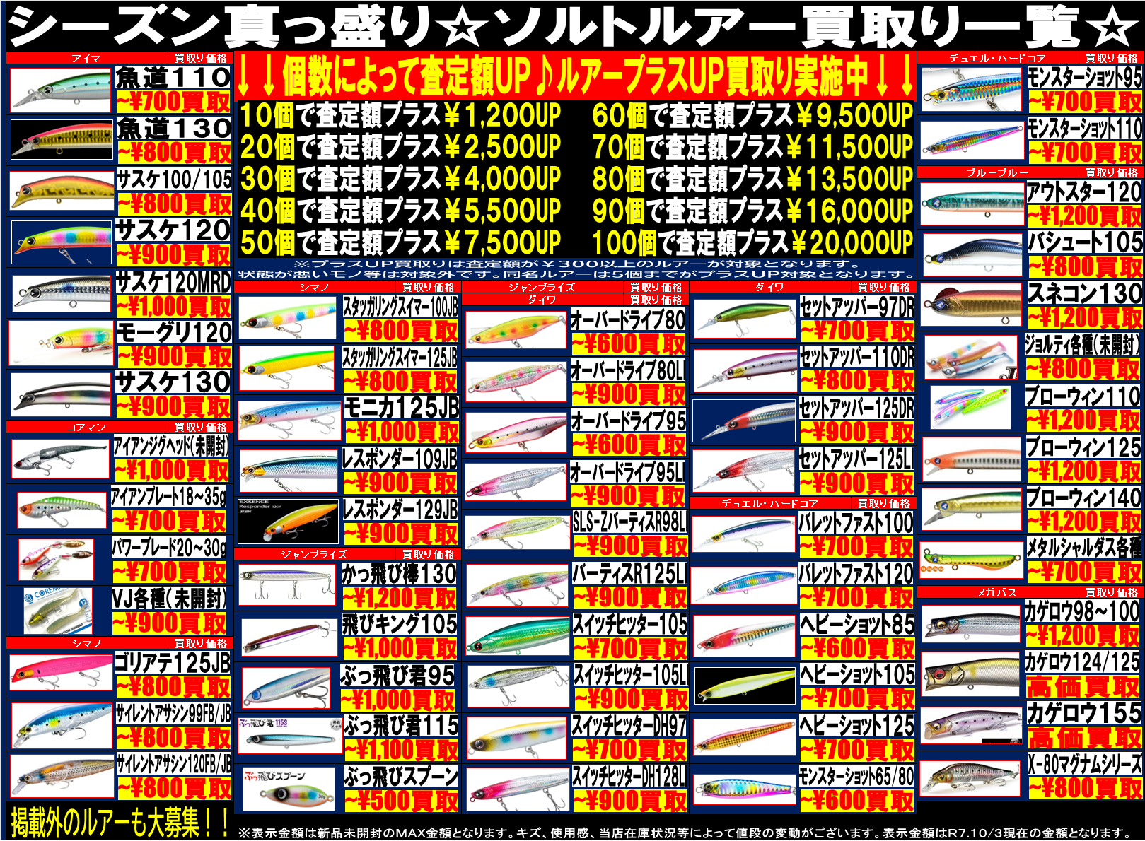 釣具コーナーから買取り情報のお知らせ! 2025年10月5日 釣具コーナーから買取り情報のお知らせ! ルアーの買取り告知を更新しました! ソルトルアー強化買取り中! 個数に応じてプラスUP金額もついちゃう♪ 掲載外のルアーも釣具スタッフが きちんと査定いたします☆ ぜひこの機会にお持ちください(≧▽≦)/ ではでは(^^)/ ※2025/10/5現在の価格となっております。 相場、在庫状況により告知なく価格が変更となる場合がございますのでご了承ください。 その他買取情報はこちら!