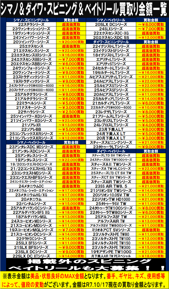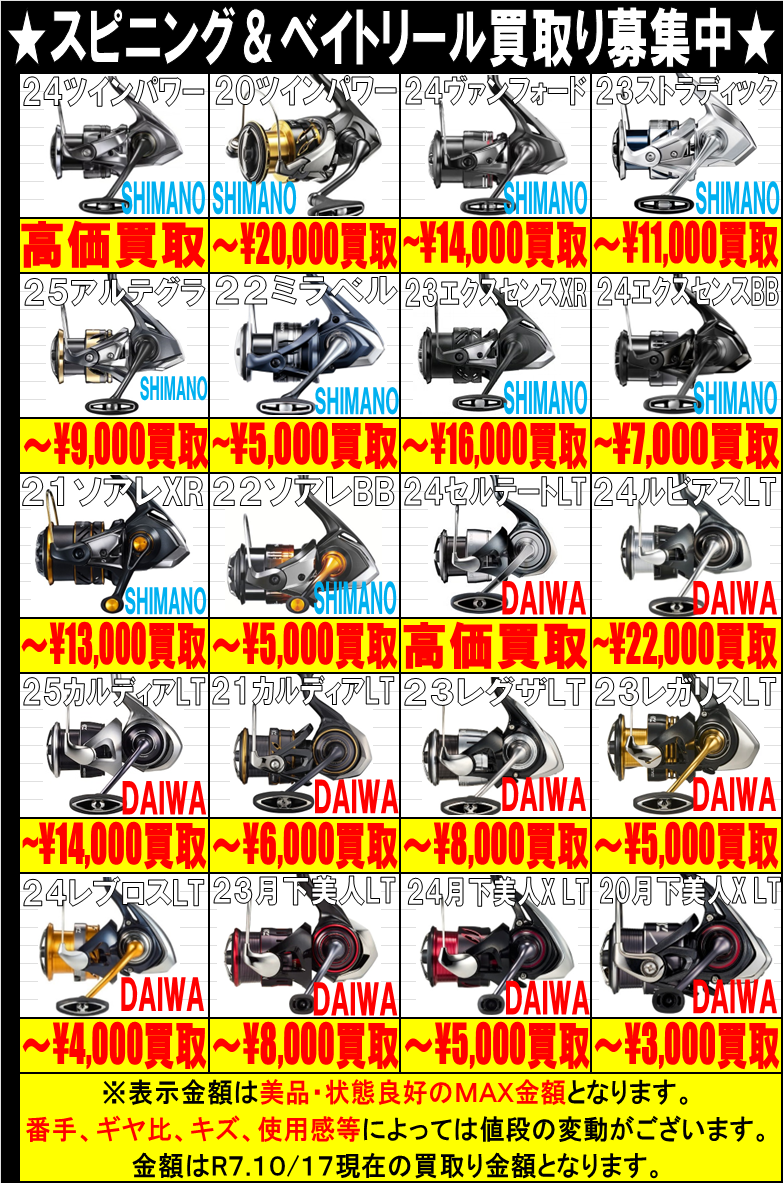 釣具コーナーから買取り情報のお知らせ! 2025年10月17日 釣具コーナーから買取り情報のお知らせ!🎣 リールの買取り告知を更新しました☆ そろそろ来年の新タックル購入に向けて 資金を作ろうかと思ってる方! おたちゅうの高額買取りを活用 しちゃってください(≧▽≦)/ ロッド&ルアーの方も買取り告知を更新 してますよ~♪過去の記事もCHECKして みてくださいね! ではでは(^^)/ ※2025/10/17現在の価格となっております。 相場、在庫状況により告知なく価格が変更となる場合がございますのでご了承ください。 その他買取情報はこちら!