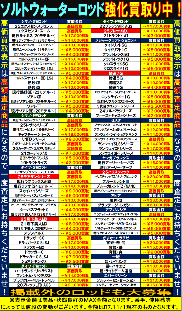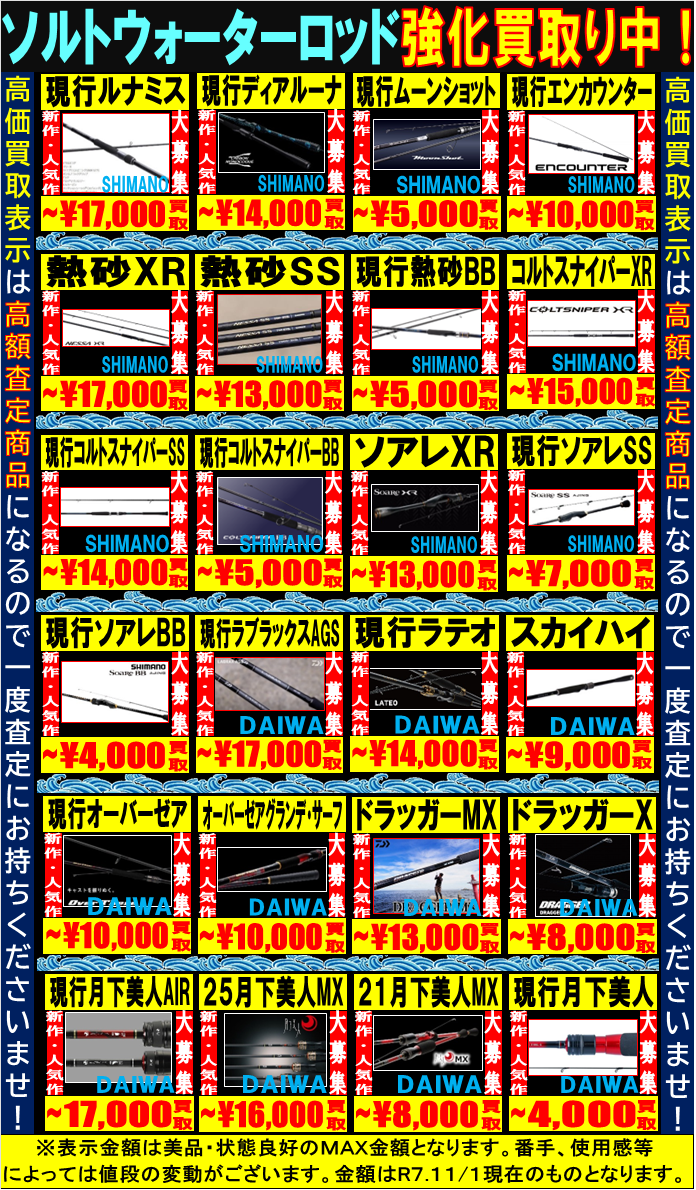★釣具コーナーから買取り情報のお知らせ!★ 2025年11月4日 釣具コーナーから買取り情報のお知らせ! ロッドの買取り告知を更新しました! 新作のあのロッドから、ハイエンドモデル、 エントリークラスまで完全網羅! 釣り好きなスタッフがきっちり査定いたしますので ぜひお持ちください(≧▽≦)/ 釣具スタッフは月・水曜以外の昼2:00から 出勤しますので、よろしくお願いします☆ ではでは(^^)/ ※2025/11/4現在の価格となっております。 相場、在庫状況により告知なく価格が変更となる場合がございますのでご了承ください。 その他買取情報はこちら!