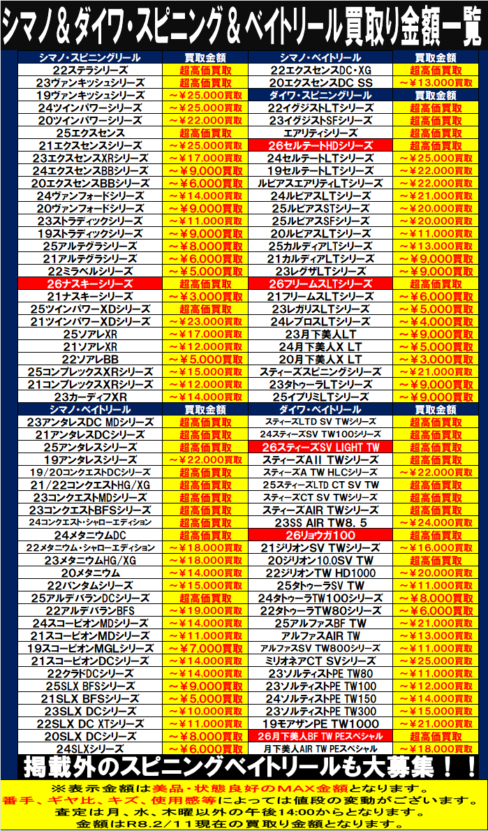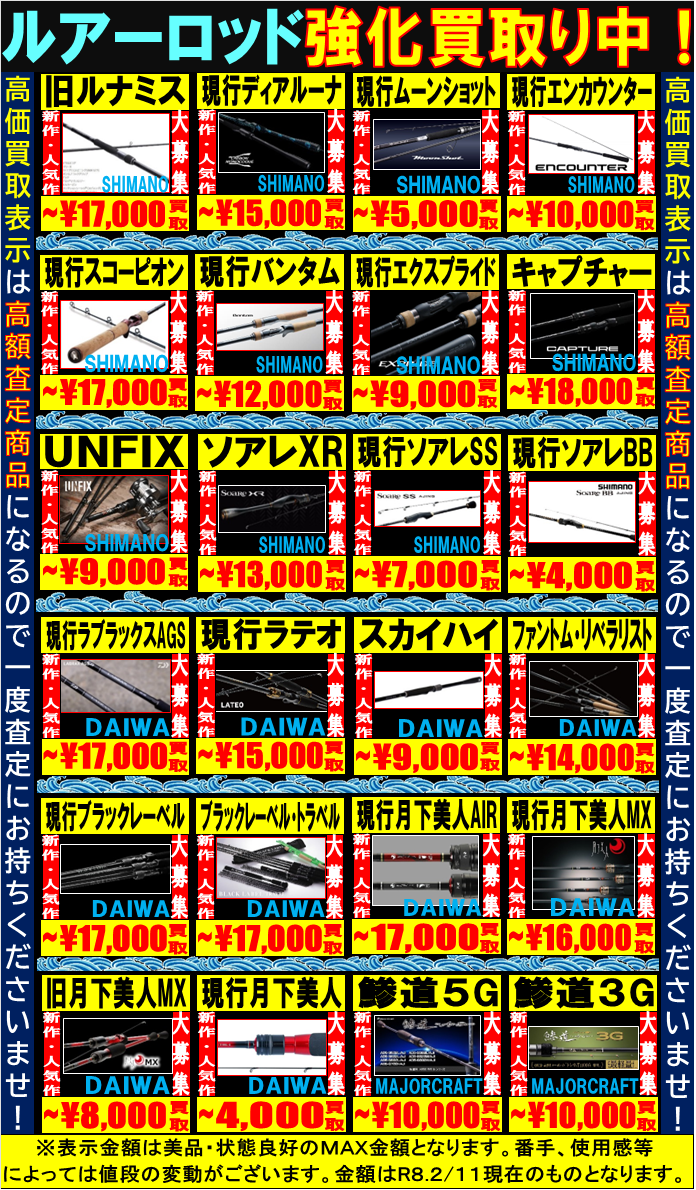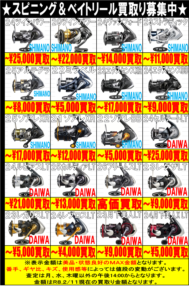ロッドとリール 買取告知更新しました! 2026年2月12日 釣具コーナーから買取り情報のお知らせ! ロッドとリールの買取り告知を更新しました! シーズンインに向けて本格的に買取り中! ぜひお売りください(≧▽≦)/ ではでは(^^)/ ※2026/2/12現在の価格となっております。 相場、在庫状況により告知なく価格が変更となる場合がございますのでご了承ください。 ****************************** その他買取情報はこちら!