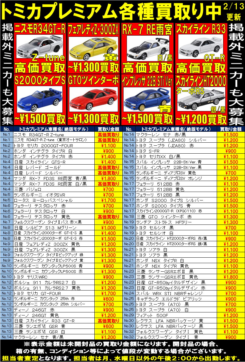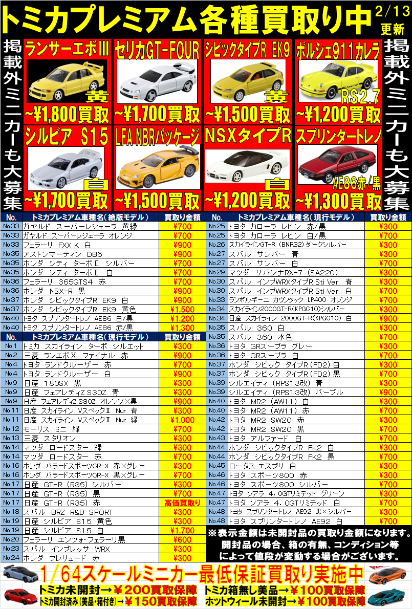 おもちゃミニカーコーナーから買取り情報のお知らせ! 2026年2月13日 おもちゃミニカーコーナーから買取り情報のお知らせ! トミカプレミアムの買取り告知を更新しました☆ 絶版モデルや発売記念モデル、最新モデルの ミニカーまで網羅してるので、たくさんお持ちの方は ぜひお持ちください(^^)♪ 地域最強買取りで頑張ります! ではでは(^^)/ ※2026/2/13現在の価格となっております。 相場、在庫状況により告知なく価格が変更となる場合がございますのでご了承ください。 ****************************** その他買取情報はこちら!