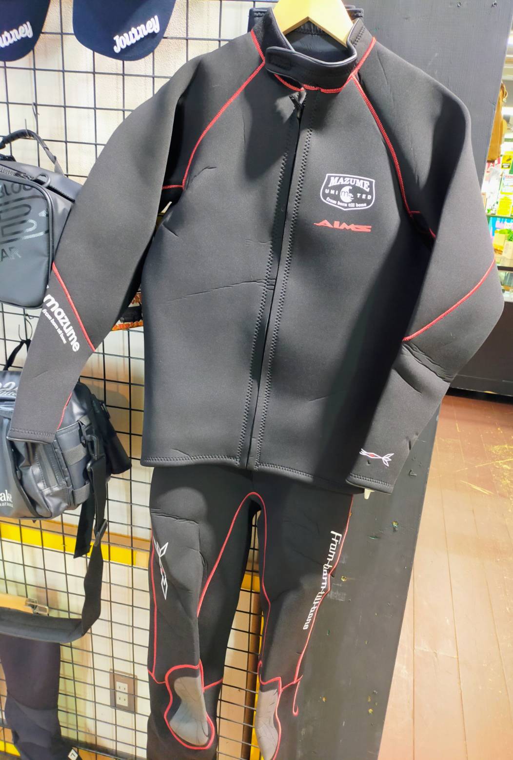 マズメのウェットスーツは、ジャケット、ロングジョン、ソックスの3点セットです。