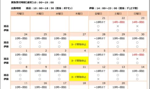 11月21日よりカード部門の買取時間が変更となります。 通常10時~19時までの受付です。 木曜日は、今まで通り休止です。 金曜日は、受付時間が18時までとなります。 イレギュラーで14時からとなる日がございます。 カレ…