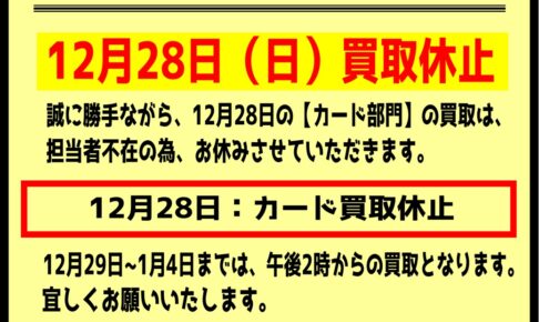 誠に勝手ながら、12月28日(日)のカード部門の買取はお休みさせていただきます。