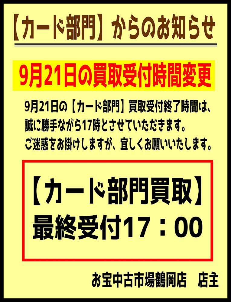 【カード部門】からのお知らせ 本日カード部門の買取の最終受付を17時とさせていただきます。