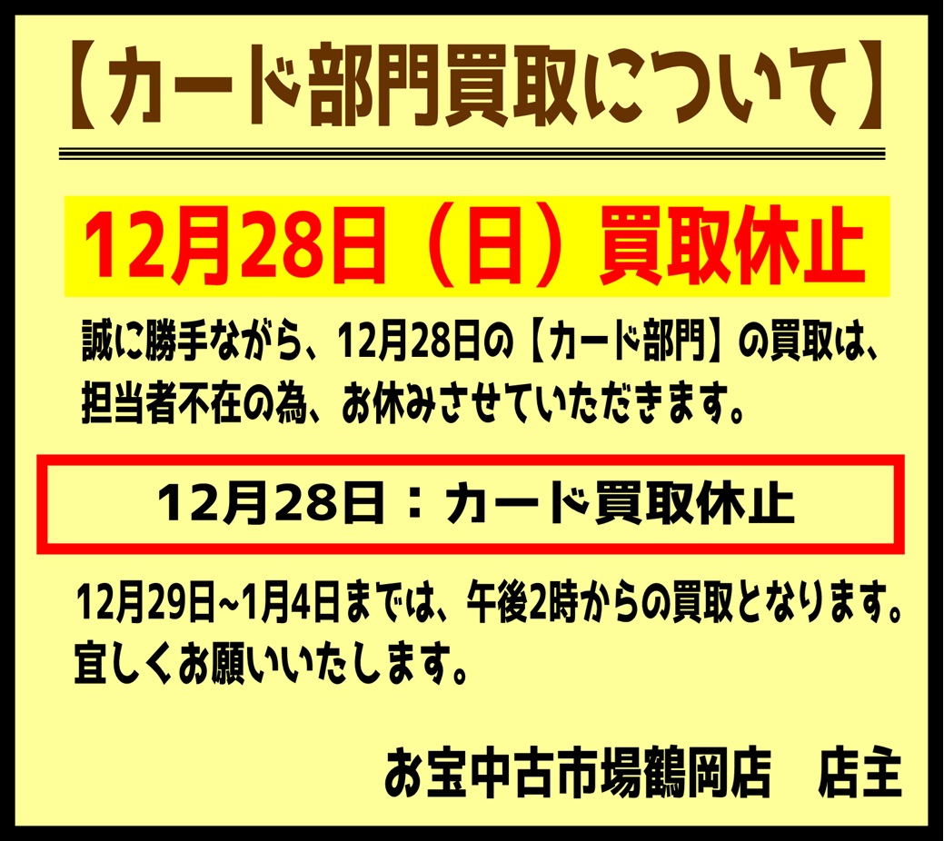 誠に勝手ながら、12月28日(日)のカード部門の買取はお休みさせていただきます。