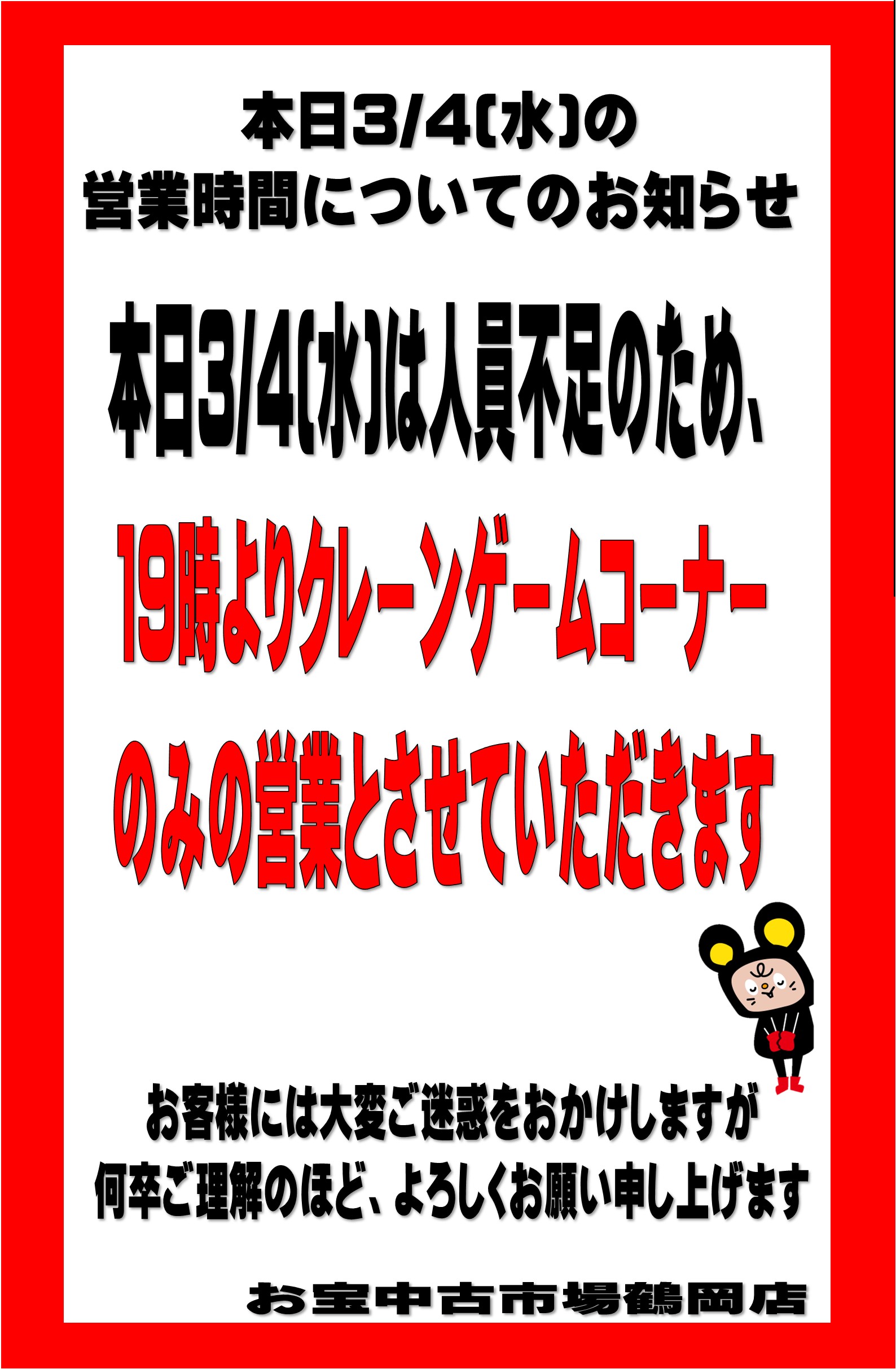 ★《3月4日》本日の営業時間のお知らせ★ 2026年3月4日 ★本日の営業時間のお知らせ★ 本日3/4(水)は人員不足のため19時よりクレーンゲームコーナーのみの営業とさせていただきます。 お客様にはご迷惑をおかけしますが、何卒ご理解のほど、よろしくお願いいたします。 ****************************** その他買取情報はこちら!