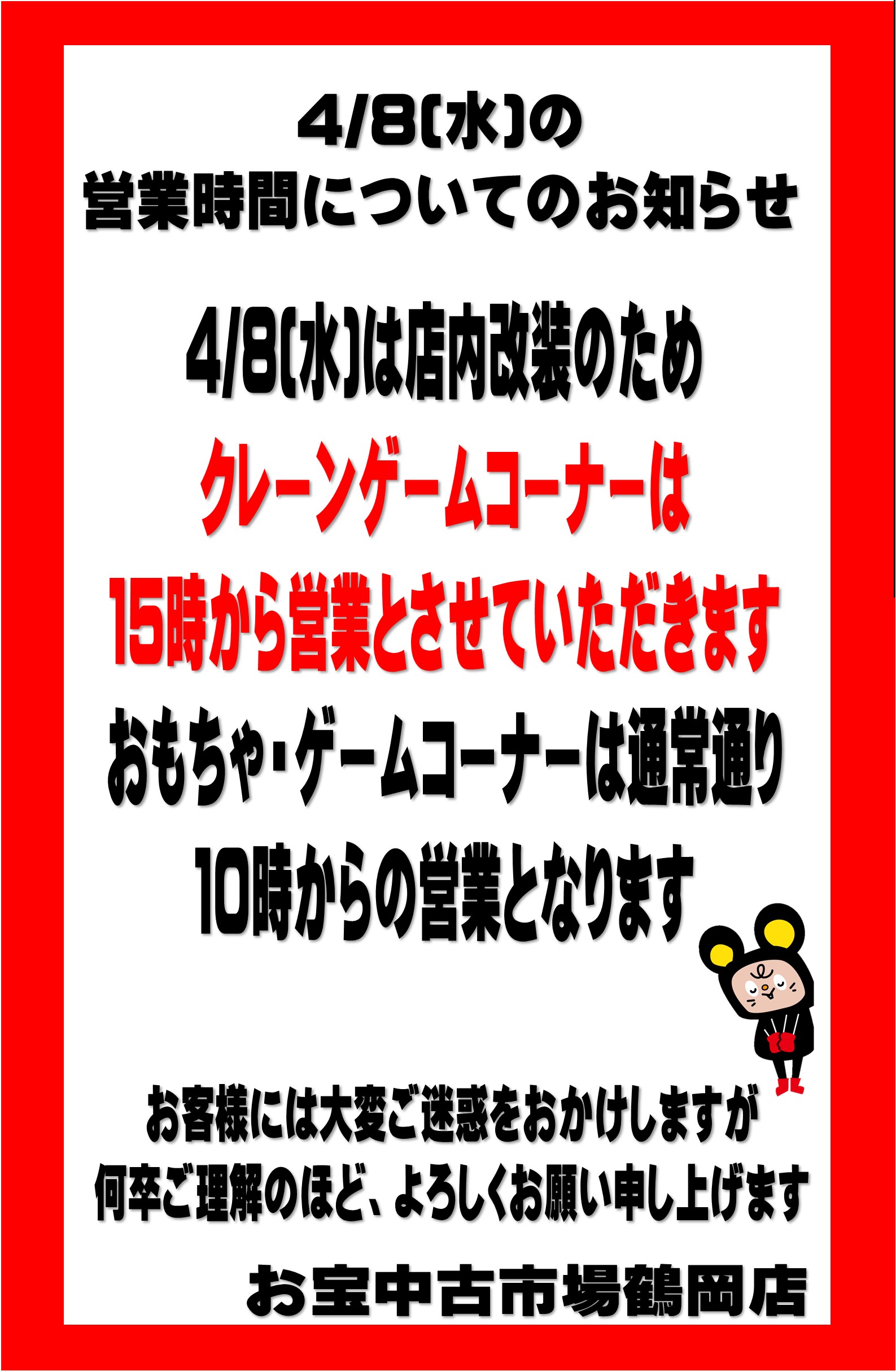 4/8(水)は店内改装のためクレーンゲームコーナーは15時からの営業となります。