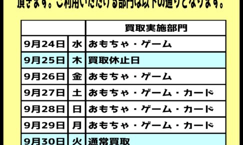【カード部門】からのお知らせ 誠に勝手ながら、9月26日金曜日まで【カード部門の買取を休止】致します。 ご迷惑お掛けしますが、宜しくお願いいたします。